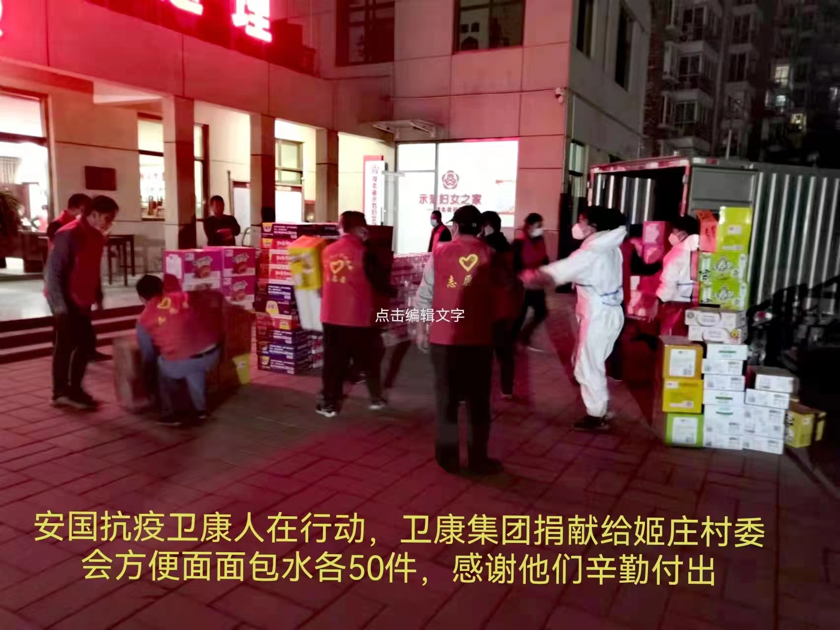 康董將愛付諸行動,他在4月7、8號,為藥城社區(qū)和姬莊村委會兩個社區(qū)捐贈了100箱方便面、100箱面包、100箱水,共計300箱應急物資。并積極響應政府號召,通過安國中藥協(xié)會捐獻現(xiàn)金五萬元,統(tǒng)籌采購中藥防疫方用于安國抗疫。這體現(xiàn)出了我們衛(wèi)康人的責任擔當,更是衛(wèi)康人的榮幸。